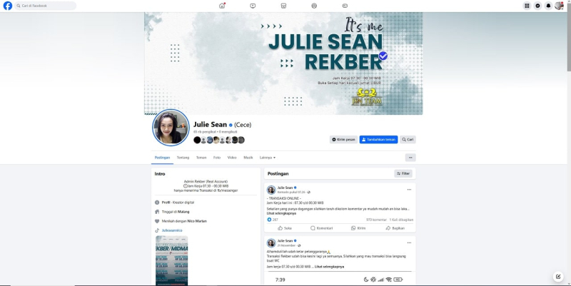 Julie Sean, atau lebih dikenal sebagai Cece, merupakan salah satu penyedia jasa rekber terpercaya dengan popularitas sangat tinggi, dengan lebih dari 449 ribu pengikut di akun Facebooknya.